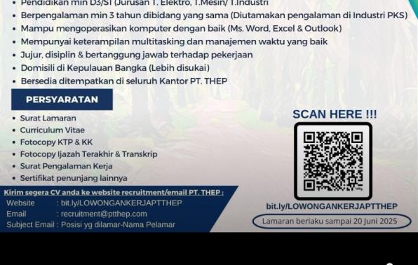 PT THEP-Bangka membuka kesempatan kerja untuk posisi: