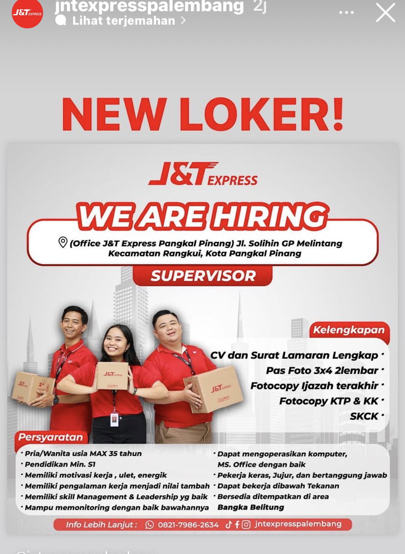 Supervisor-J&T Express Palembang-penempatan Pangkalpinang