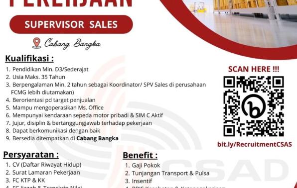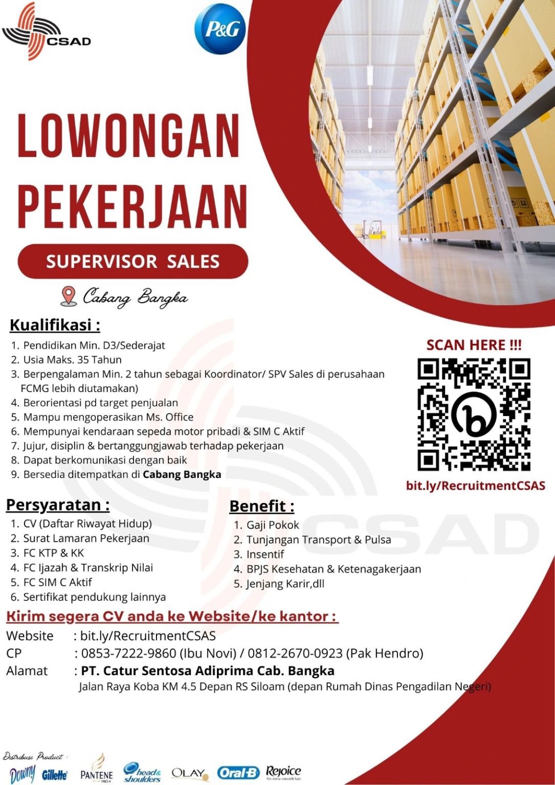 PT Catur Sentosa Adiprima (Ritail bahan bangunan) membuka kesempatan kerja untuk posisi Supervisor Sales penempatan Cabang Bangka.