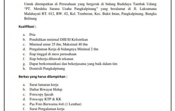 info Loker Teknisi Listrik @PT Merdeka Sarana Usaha Pangkalpinang