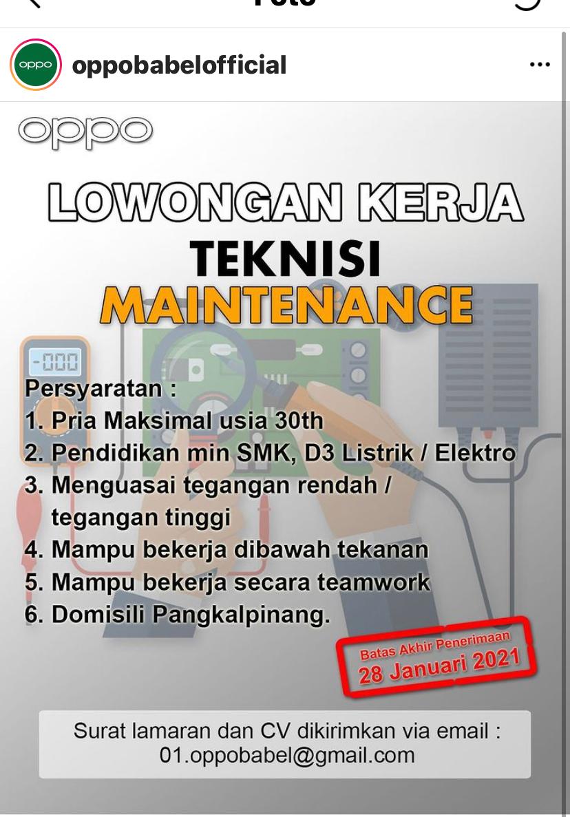 OPPO BABEL OFFICIAL Membutuhkan tenaga Teknisi Maintenance- untuk ditempatkan di Oppo Official @Pangkalpinang.