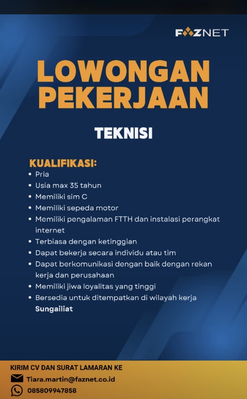 PT  Mitra LIntas Multimediia bergerak di bidang provider jaringan internet FAZNET membuka kesempatan kerja untuk posisi Teknisi penempatan area Sungailiat.