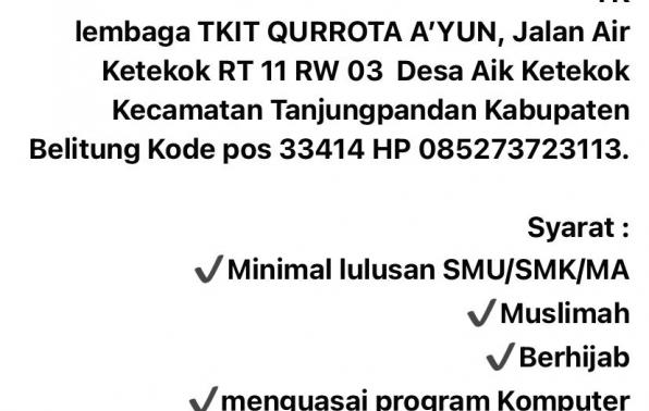 lembaga TKIT QURROTA A’YUN, Jalan Air Ketekok RT 11 RW 03  Desa Aik Ketekok Kecamatan Tanjungpandan Kabupaten Belitung Kode pos 33414 HP 085273723113.