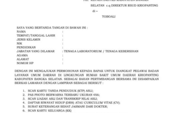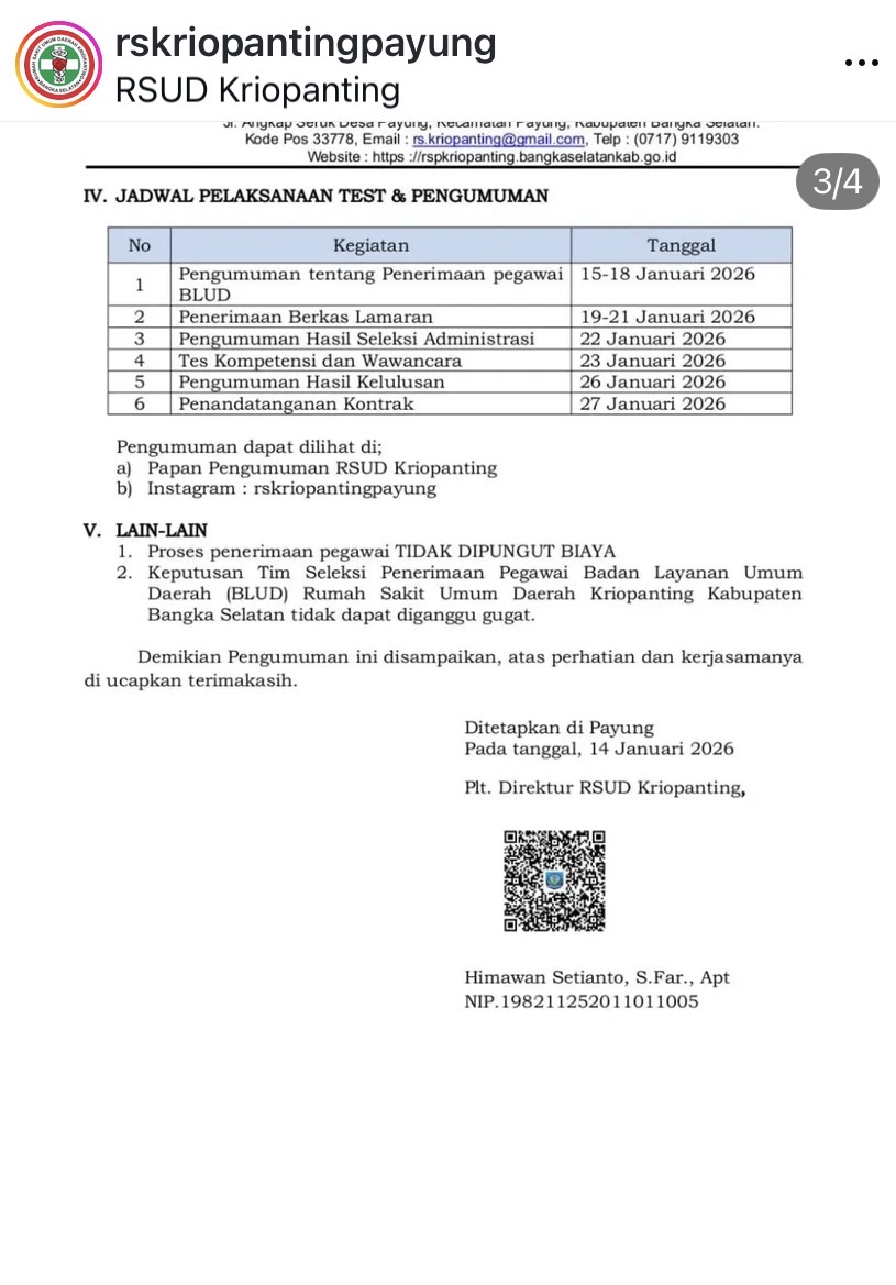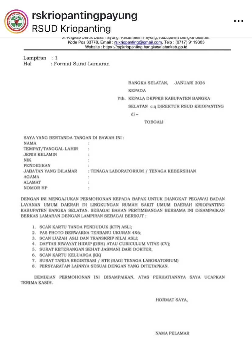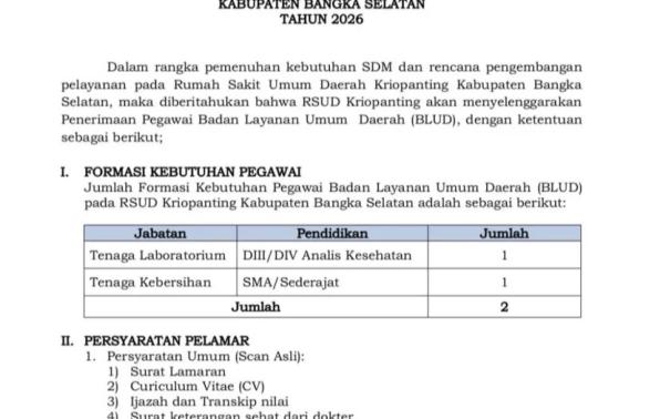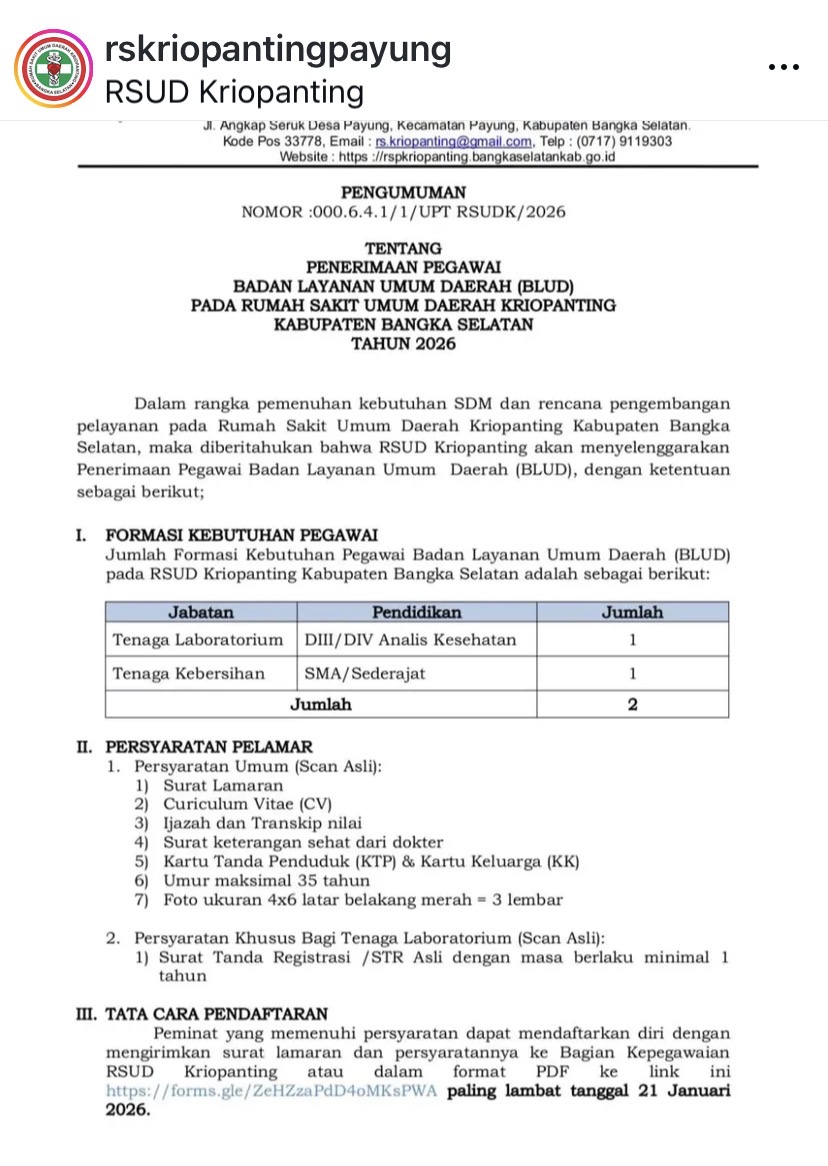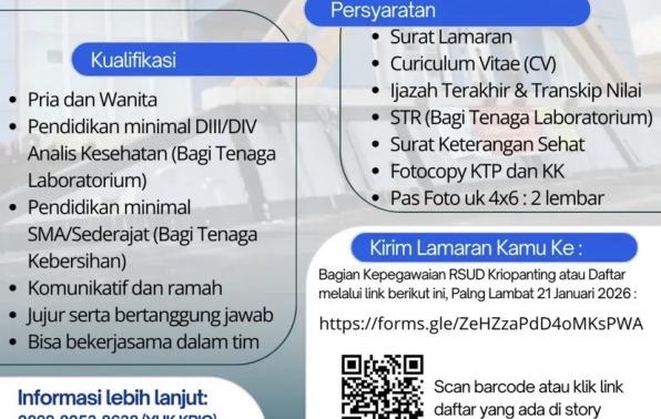 Rumah Sakit Umum Kriopanting Payung membuka kesempatan kerja untuk posisi Tenaga: