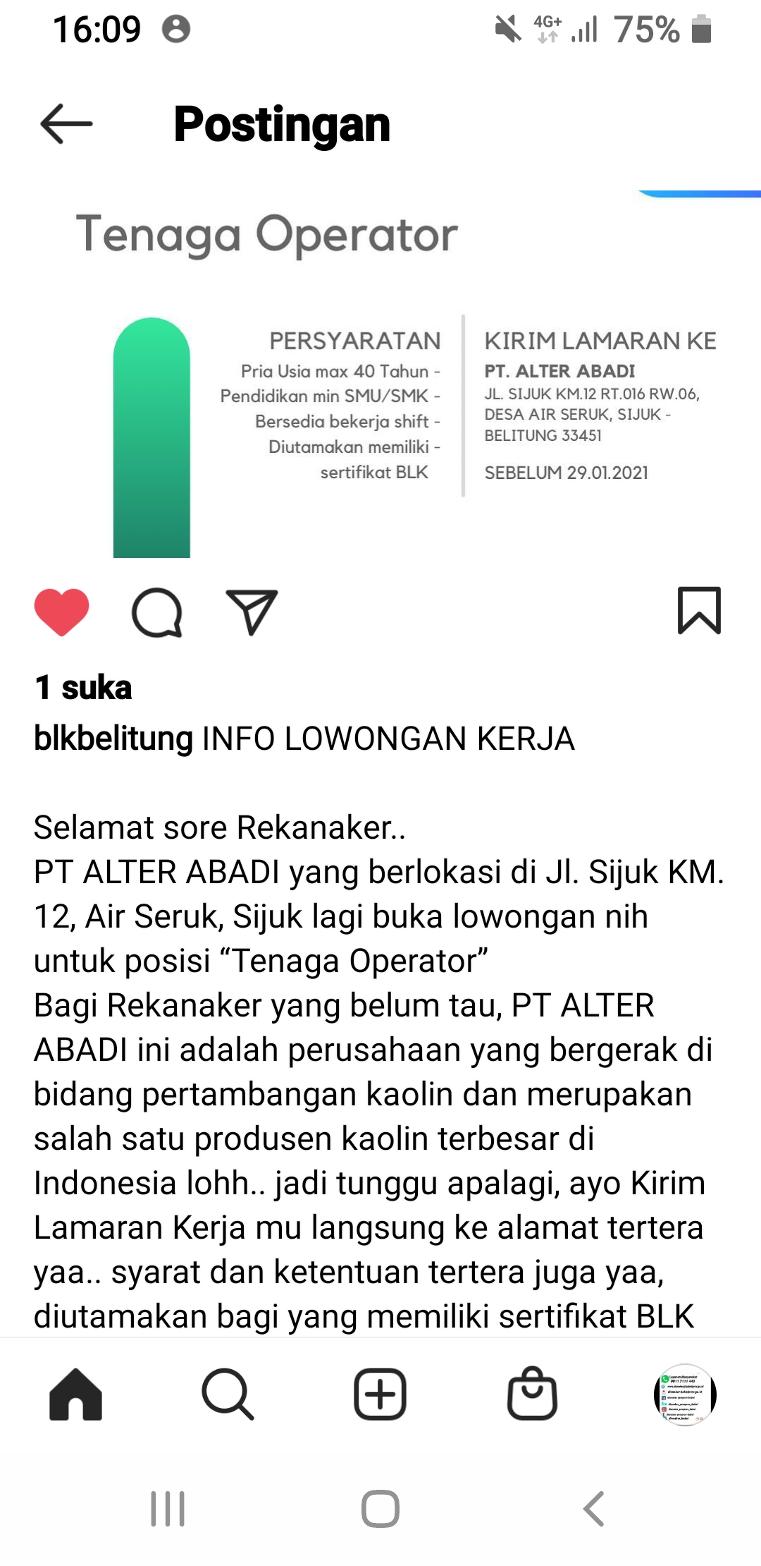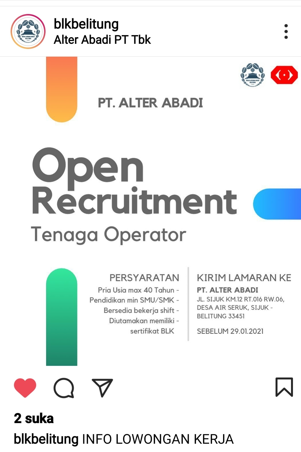 info Loker Tenaga Operator-PT.ALTER ABADI @Sijuk-Belitung