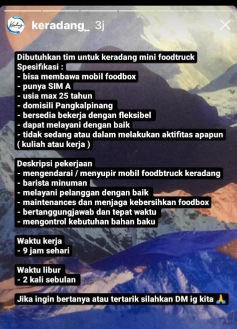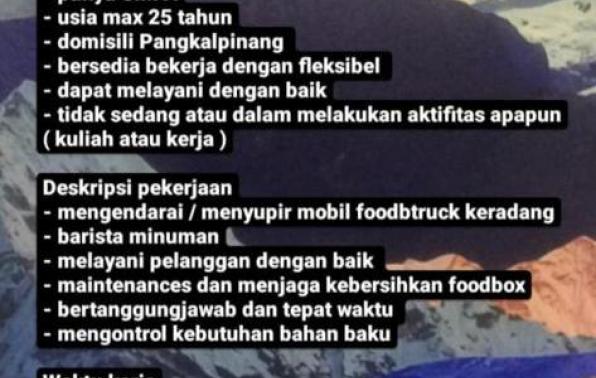 Spesifikasi : dapat mengendarai mobil Foodtruck,punya SIM A, usia maksimal 25 tahun,Domisili Pangkalpinang,dapat melayani dengan baik kepada konsumen,Tidak sedang/dalam melakukan aktifitas apapun(kuliah/ kerja).