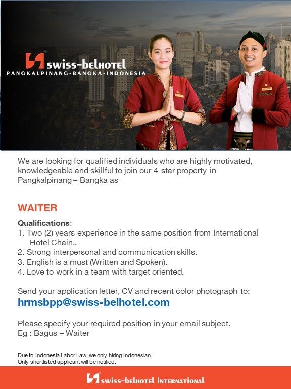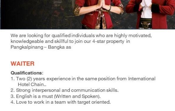 Swiss Bel Hotel Pangkalpinang membuka kesempatan kerja untuk posisi Waiter.