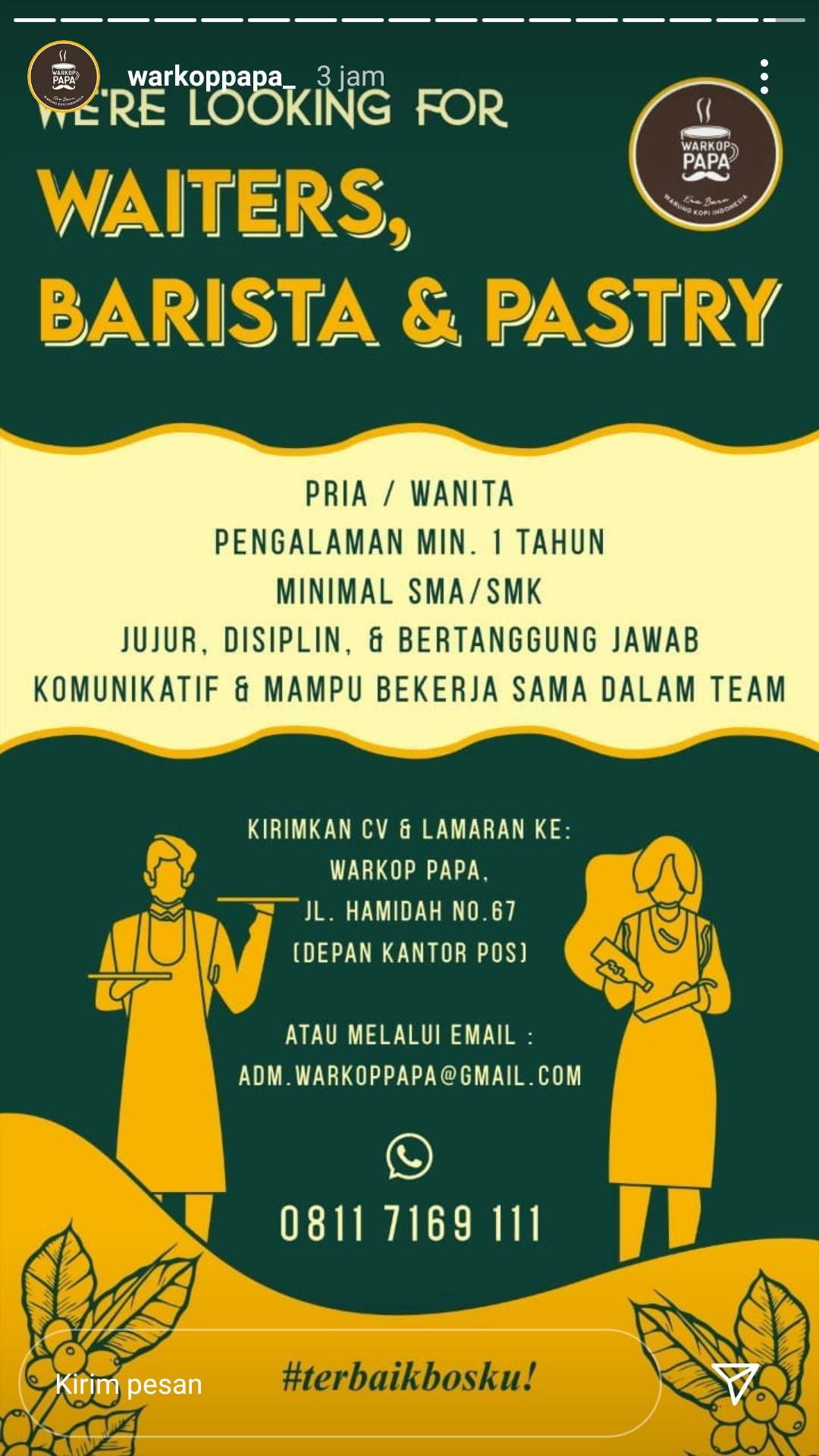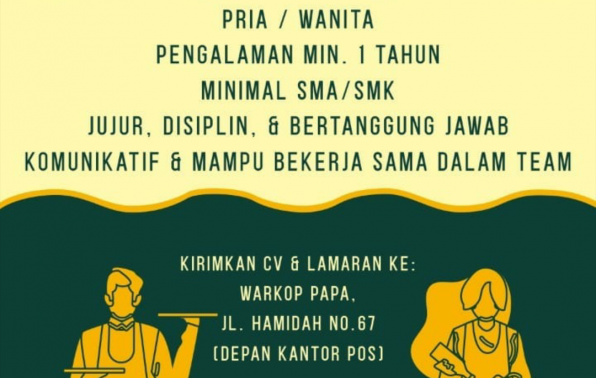 Membuka kesempatan kerja dalam posisi WAITERS,BARISTA & PASTRY.