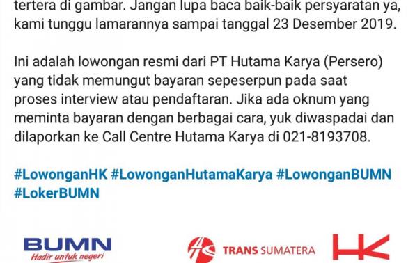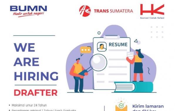 Tahun baru, karir baru! Siapkah hashtag#Infrabuddy bergabung dengan PT Hutama Karya (Persero)? Siapkan CV terbaikmu untuk menjadi Drafter di hashtag#TransSumatera dan kirim lamaran ke alamat email yang tertera di gambar. Jangan lupa baca baik-baik persyaratan ya, kami tunggu lamarannya sampai tanggal 23 Desember 2019. Ini adalah lowongan resmi dari PT Hutama Karya (Persero) yang tidak memungut bayaran sepeserpun pada saat proses interview atau pendaftaran. Jika ada oknum yang meminta bayaran dengan berbagai cara, yuk diwaspadai dan dilaporkan ke Call Centre Hutama Karya di 021-8193708.