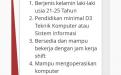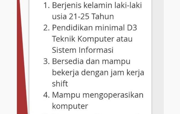 - Pendidikan minimal D3 Teknik Komputer atau Sistem Informasi