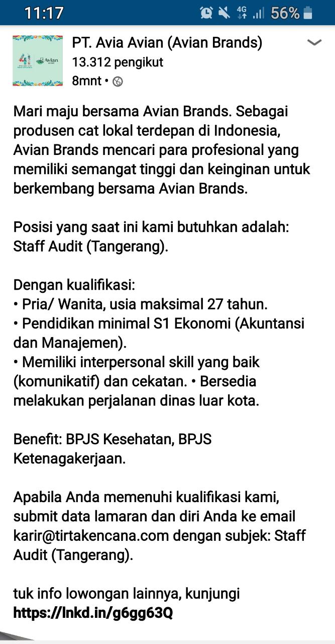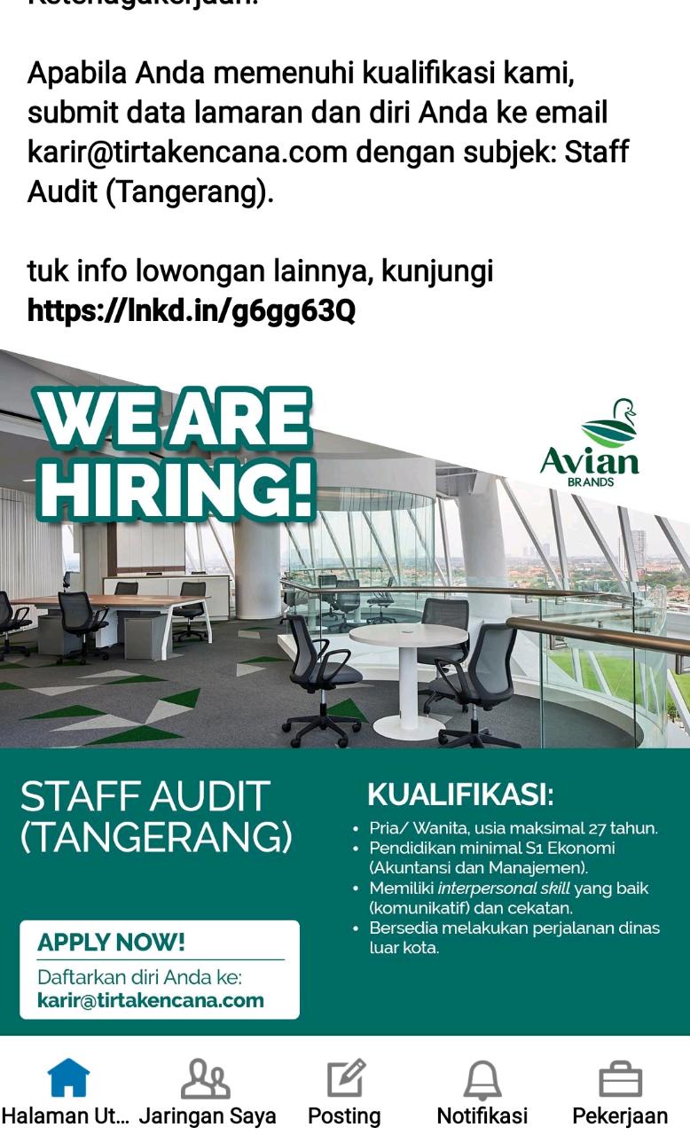 Posisi yang saat ini kami butuhkan adalah: Staff Audit (Tangerang).