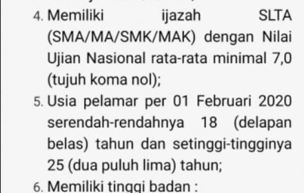 Usia Pelamar per 01 Februari 2020 serendah-rendahnya 18 tahun dan setinggi-tinggi nya 25 tahun.