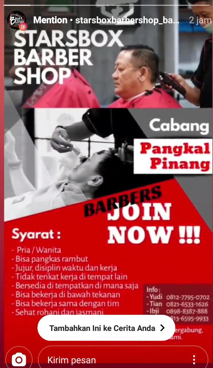 Dikirim: 14 Feb 2020, 12:02 Sumber: https://www.instagram.com/starsboxbarbershop_bangka/Penulis: jeffrin phm siregarFotografer: -Editor: jeffrin phm siregarBidang Informasi: PramasTags: info Lowongan Kerja.