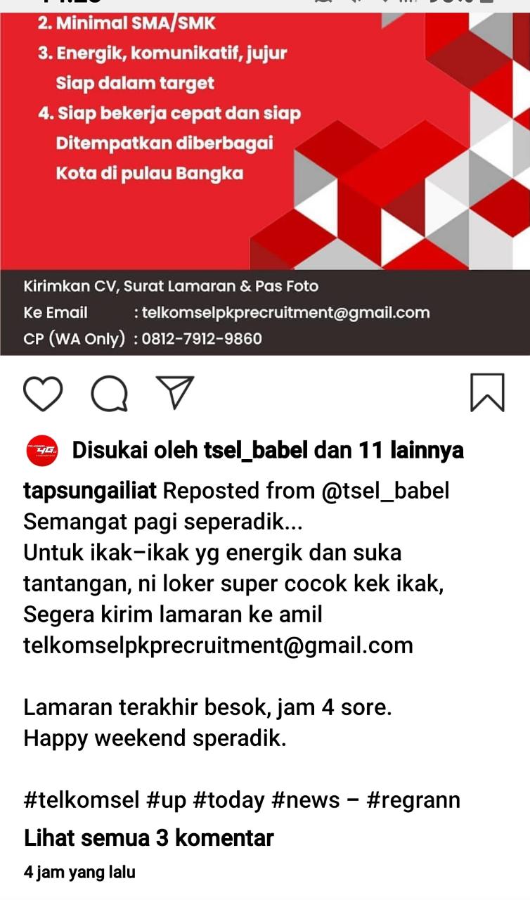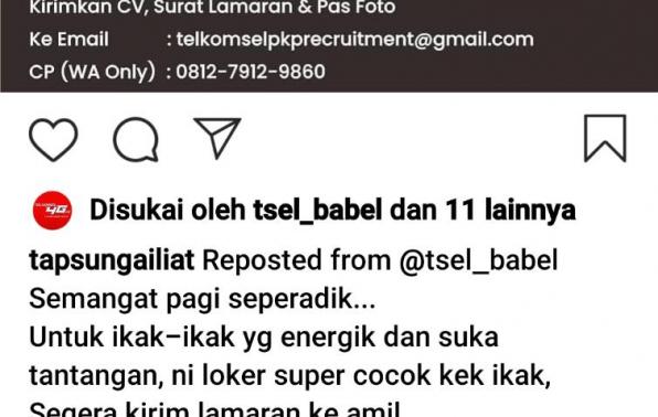Dikirim: 14 Feb 2020, 03:02 Sumber: https://www.instagram.com/p/B8iBlHWBel8/, https://www.instagram.com/p/B8h2E4NhzH-/Penulis: jeffrin phm siregarFotografer: -Editor: jeffrin phm siregarBidang Informasi: PramasTags: info lowongan kerja