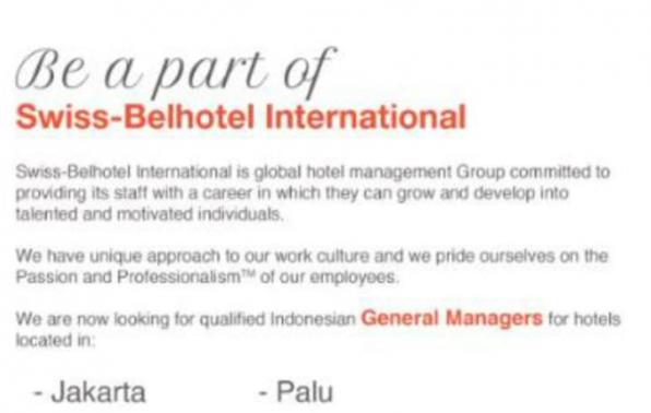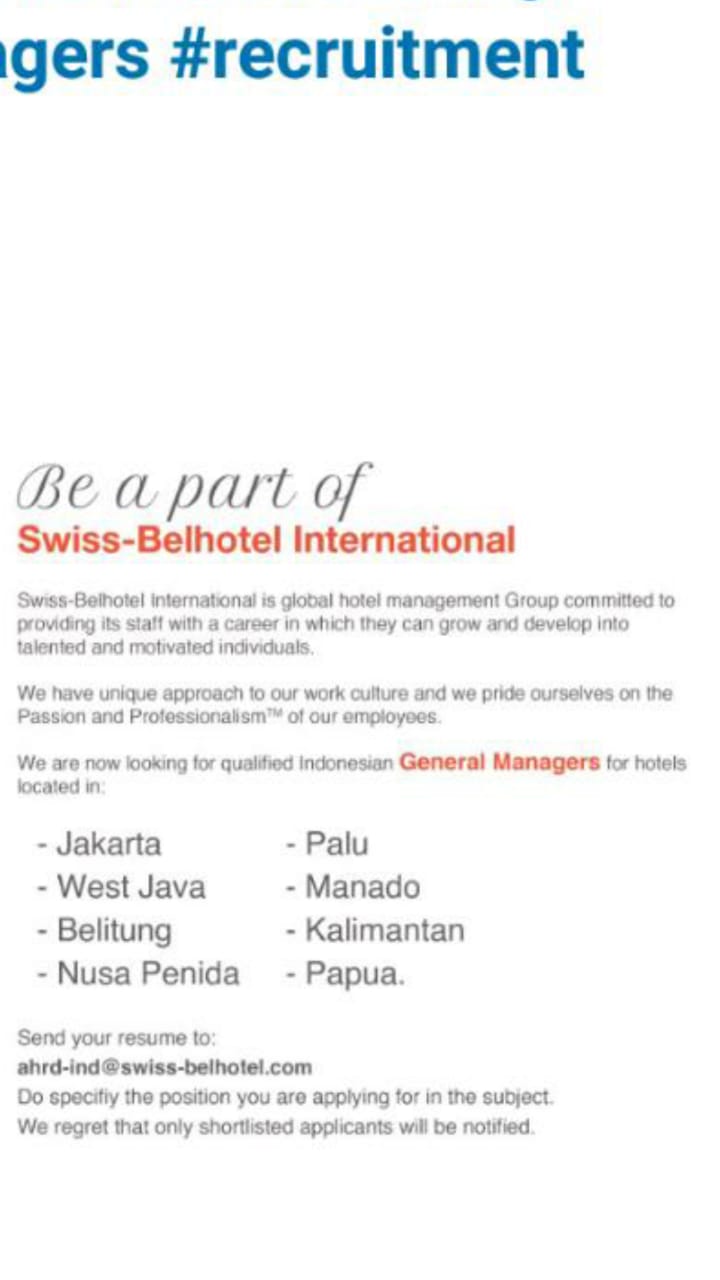 we are looking for qualified General Managers with Passion and Profesionalism to lead our hotel in Jakarta , west Java, Belitung, Nusa Penida,Palu, Manado, Kalimantan &Papua.