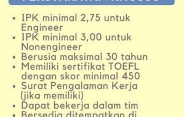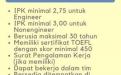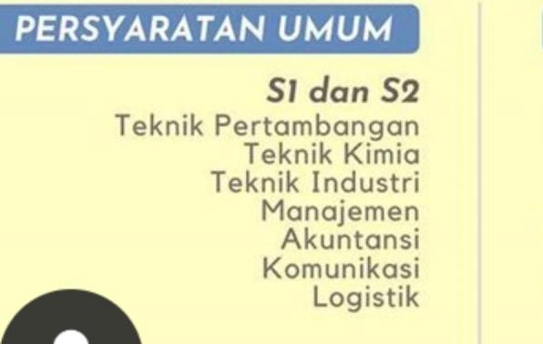 Persyaratan Umum : S1 dan S2,( teknik pertambangan, teknik kimia, teknik industri, manajemen, akuntansi, Komunikasi dan Logistik), D3 ( analis Kimia, kimia murni dan Mekatronika)