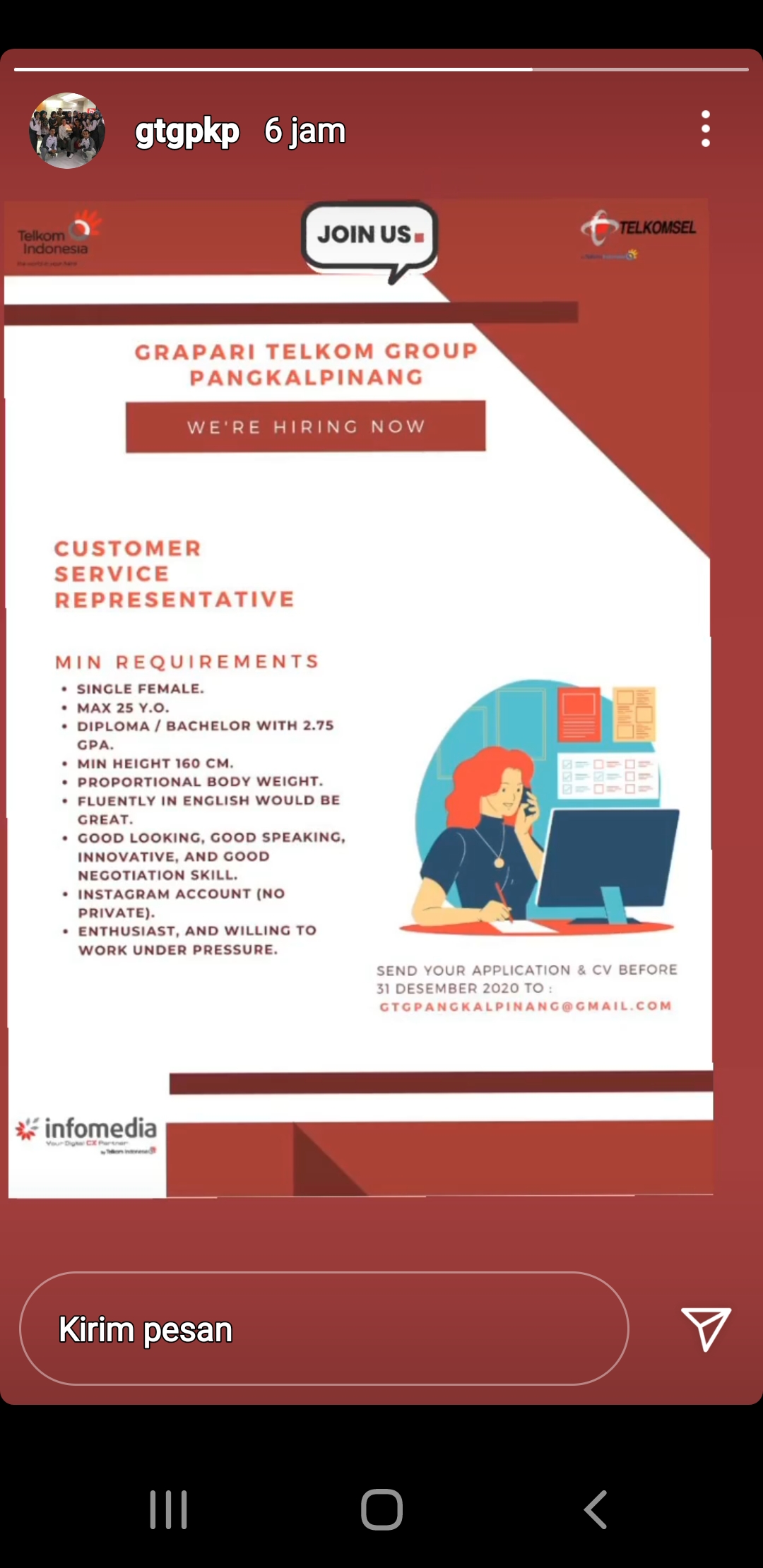 Info Lowongan kerja CUSTOMER SERVICE REPRESENTATIVE @Grapari Telkom