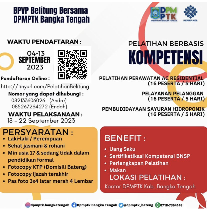 BPVP/Balai Pelatihan Vokasi & Produktifitas Belitung bersama DPMPTK Bangka Tengah membuka kesempatan Pelatihan Gratis bagi masyarakat(Domisili & KTP Bangka Tengah)