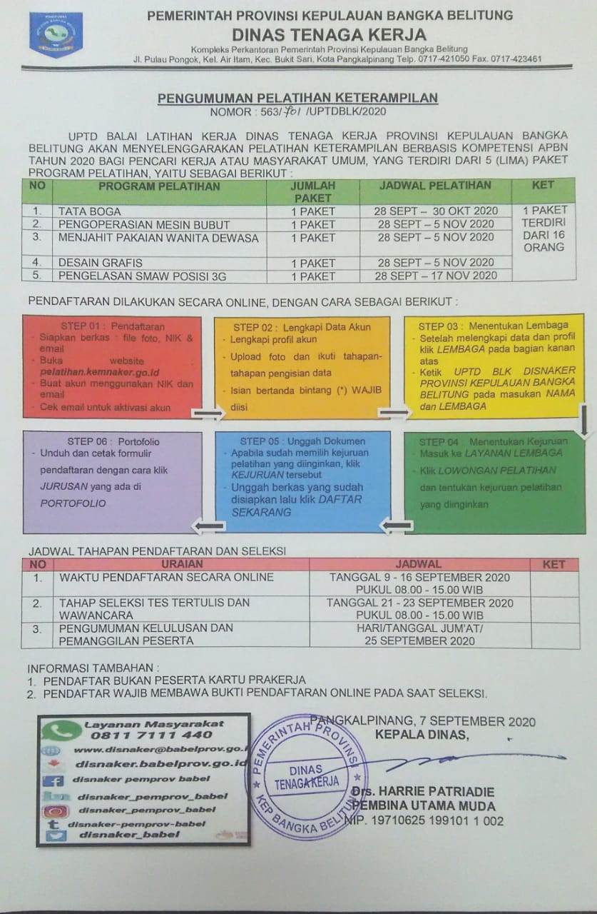 Info Pelatihan Gratis yg diselenggarakan oleh BLK Disnaker Babel dengan 5(lima)kelas kejuruan.pendaftaran dimulai 09 September 2020- 16 September 2020.
