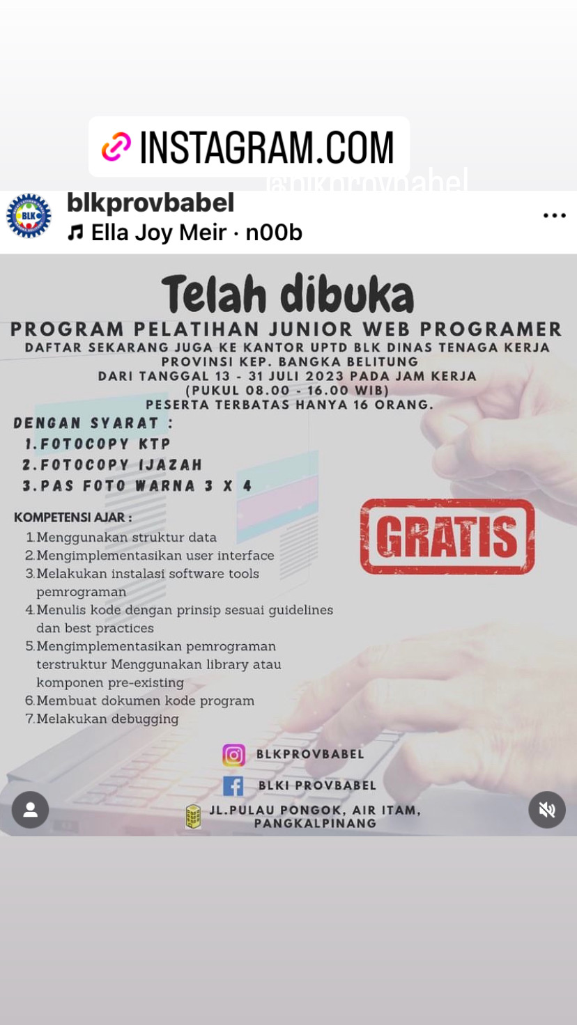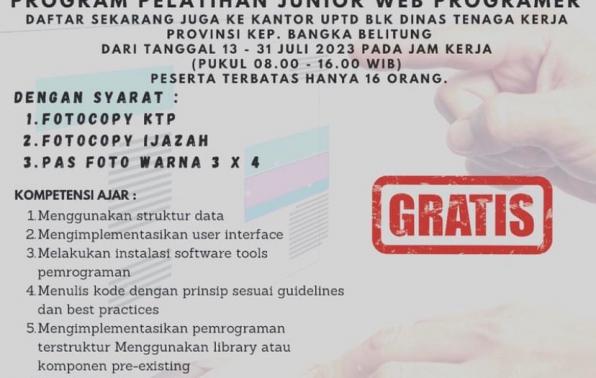 Info Pelatihan Gratis posisi Junior Web Programer-Balai Latihan Kerja/BLK Bangka