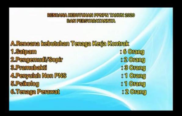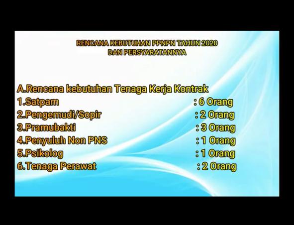 Kebutuhan Tenaga KontrakĀ utk posisi : satpam(6 orang), driver(2 orang), pramubakti(3 orang), penyuluh non PNS(1 orang), psikolog(1 orang), tenaga perawat(2 orang).