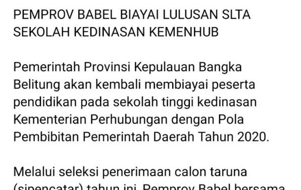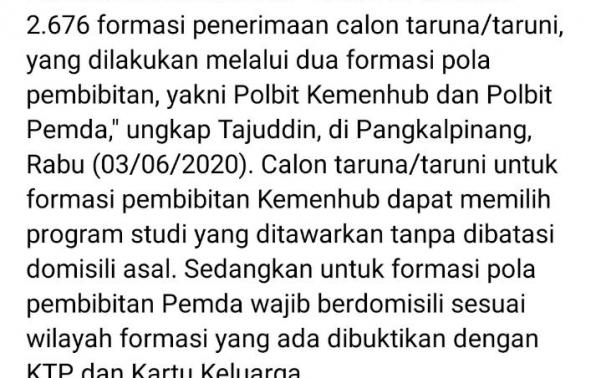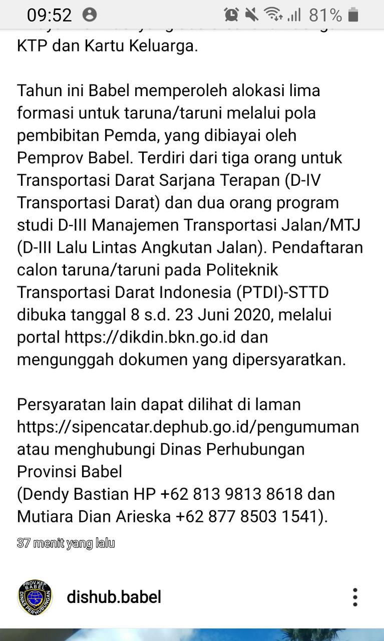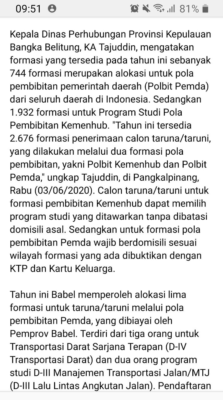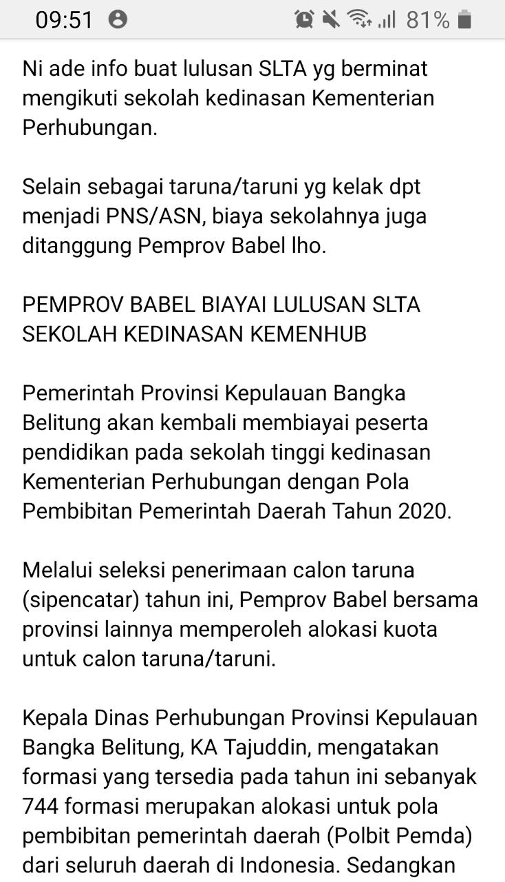 Di Tahun 2020 Pemerintah Pemprov Babel @dishub.babel Peroleh Alokasi 5(lima)formasi untuk TARUNA/i yang akan dibiayai oleh PEMPROV BABEL.