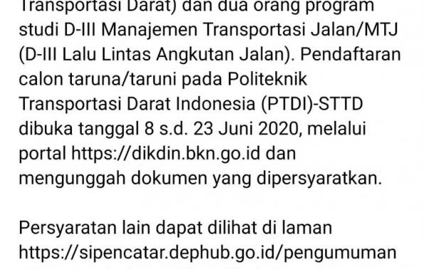 Pendaftaran Calon Taruna/iPada Politeknik Transportasi Darat Indonesia/PTDI-STTD Mulai dibuka tanggal 08-23 Juni 2020 melalui portal https:/dikdin.bkn.go.id ATAU dapat dilihat pada Laman https://sipencatar.dephub.go.id/pengumuman