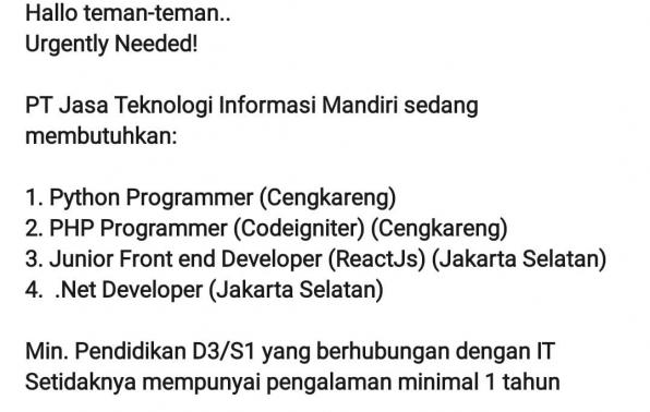 Hallo teman-teman.. Urgently Needed! PT Jasa Teknologi Informasi Mandiri