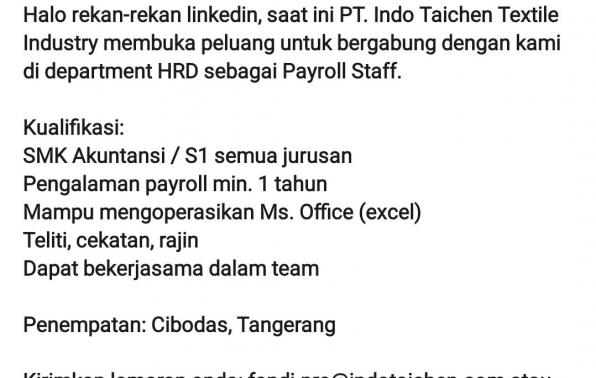 Halo rekan-rekan, saat ini PT. Indo Taichen membuka peluang untuk anda menjadi bagian di department HRD kami bergerak di bidang textil