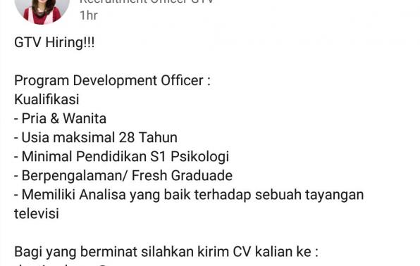 Program Development Officer : Kualifikasi - Pria & Wanita - Usia maksimal 28 Tahun - Minimal Pendidikan S1 Psikologi - Berpengalaman/ Fresh Graduade - Memiliki Analisa yang baik terhadap sebuah tayangan televisi.