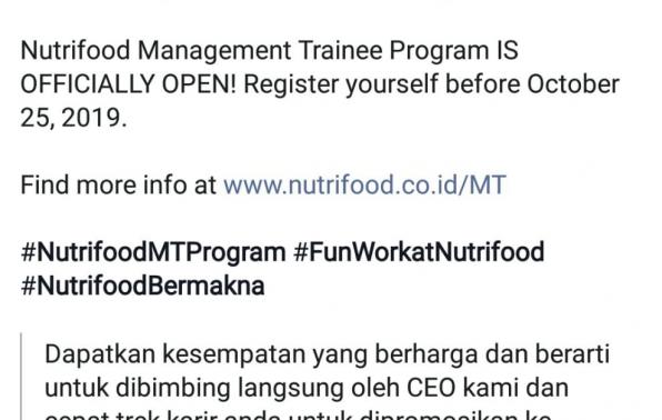 Get valuable and meaningful opportunity to be mentored directly by our CEO and fast track your career to be promoted to a leadership level. Nutrifood Management Trainee Program IS OFFICIALLY OPEN! Register yourself before October 25, 2019.