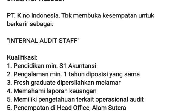 PT. Kino Indonesia,Tbk membuka kesempatan untuk berkarir sebagai: "INTERNAL AUDIT STAFF", Penempatan di Head Office, Alam Sutera.