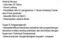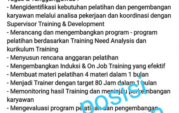 Kriteria Khusus: - Usia Max 25 Tahun - Good Looking - Pendidikan Min S1 pengalaman 1 Tahun di bidang Trainer atau Fresh graduate - Memiliki SIM A & SIM C - Penempatan Jakarta Barat Tugas & Tanggungjawab : - Mengidentifikasi kebutuhan pelatihan dan pengembangan karyawan melalui analisa pekerjaan dan koordinasi dengan Supervisor Training & Development - Merancang dan mengembangkan program - program pelatihan berdasarkan Training Need Analysis dan kurikulum Training - Menyusun rencana anggaran pelatihan - Mengembangkan Induksi & On Job Training yang efektif - Membuat materi pelatihan 4 materi dalam 1 bulan - Menjadi Trainer dengan target 80 Jam dalam 1 bulan - Memonitoring hasil Training dan meninjau perkembangan karyawan - Mengevaluasi program pelatihan dan pengembangan - Mengembangkan metode pelatihan agar lebih efektif dan up to date - Merekap admnisitrasi Pelatihan - Membuat laporan bulanan Pelatihan kepada supervisor Training & HRBP