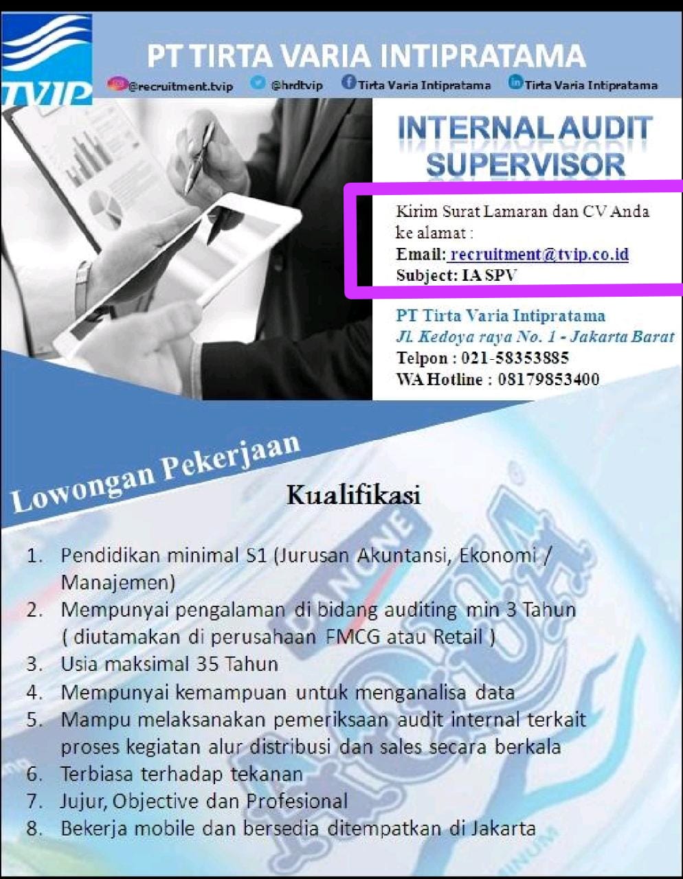 Lowongan untuk posisi Internal Audit Supervisor berlokasi di Jakarta Barat.