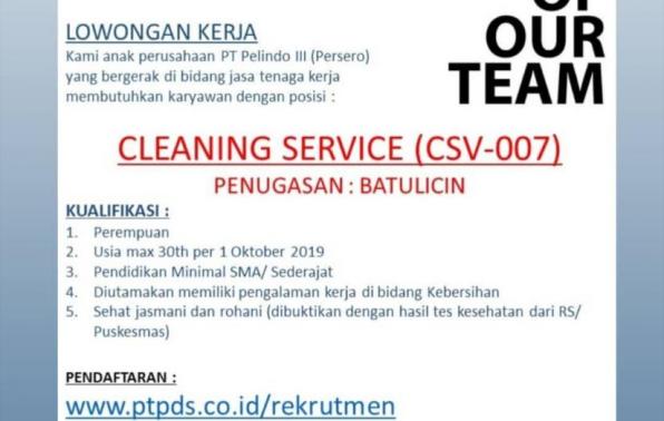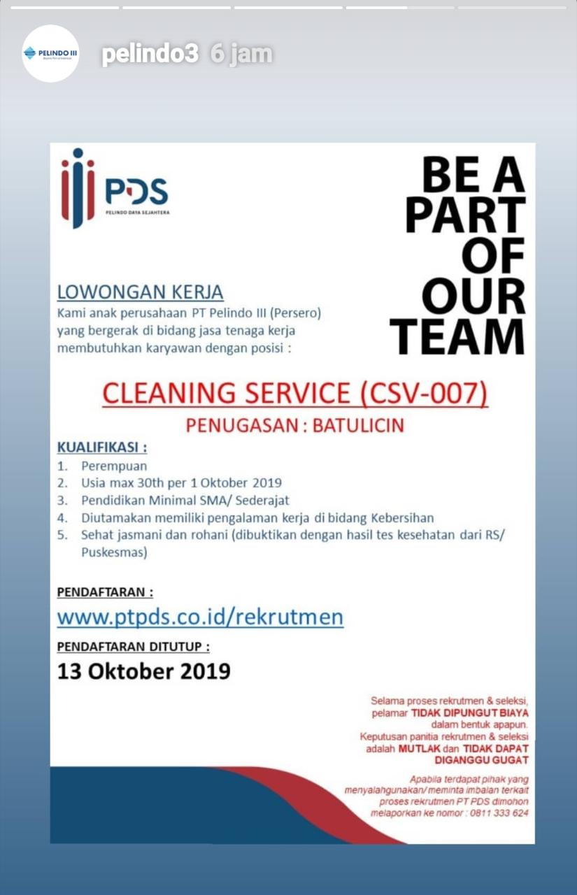 info Lowker untuk Posisi Cleaning Servis di anak Perusahaan PT.Pelindo III, untuk penugasan di Batulicin, pendaftaran berakhir 13 Oktober 2019