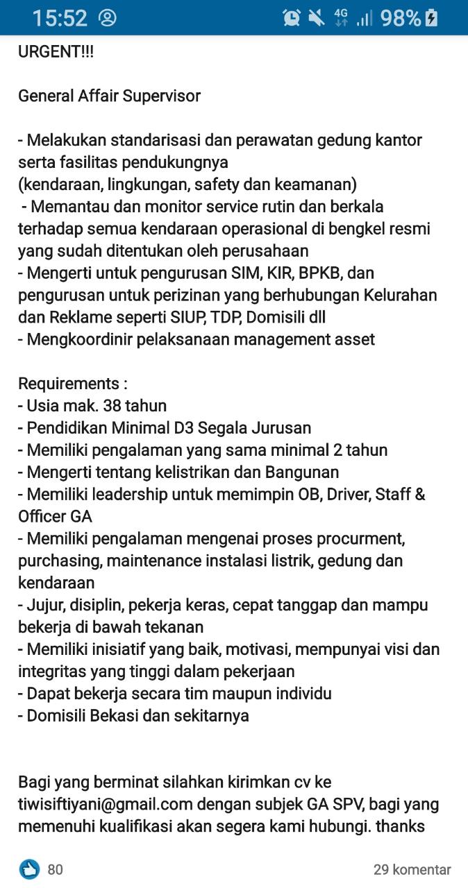 Melakukan standarisasi dan perawatan gedung kantor serta fasilitas pendukungnya (kendaraan, lingkungan, safety dan keamanan) - Memantau dan monitor service rutin dan berkala terhadap semua kendaraan operasional di bengkel resmi yang sudah ditentukan oleh perusahaan - Mengerti untuk pengurusan SIM, KIR, BPKB, dan pengurusan untuk perizinan yang berhubungan Kelurahan dan Reklame seperti SIUP, TDP, Domisili dll - Mengkoordinir pelaksanaan management asset Requirements : - Usia mak. 38 tahun - Pendidikan Minimal D3 Segala Jurusan - Memiliki pengalaman yang sama minimal 2 tahun - Mengerti tentang kelistrikan dan Bangunan - Memiliki leadership untuk memimpin OB, Driver, Staff & Officer GA - Memiliki pengalaman mengenai proses procurment, purchasing, maintenance instalasi listrik, gedung dan kendaraan - Jujur, disiplin, pekerja keras, cepat tanggap dan mampu bekerja di bawah tekanan - Memiliki inisiatif yang baik, motivasi, mempunyai visi dan integritas yang tinggi dalam pekerjaan - Dapat bekerja secara tim maupun individu - Domisili Bekasi dan sekitarnya
