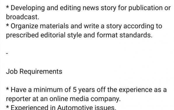 We are Looking for Reporter Otomotif Solo ! *Penempatan Solo* - Job Description * Developing and editing news story for publication or broadcast. * Organize materials and write a story according to prescribed editorial style and format standards. - Job Requirements * Have a minimum of 5 years off the experience as a reporter at an online media company. * Experienced in Automotive issues. * Strong Journalism background with proven writing and editing skills, exceptional organizational skills, and highly experienced in managing writers. * An active Social Media user. * Have the ability to work under pressure. * Agree to be placed in Solo, Central Java.