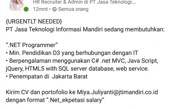{URGENTLT NEEDED} PT Jasa Teknologi Informasi Mandiri sedang membutuhkan: