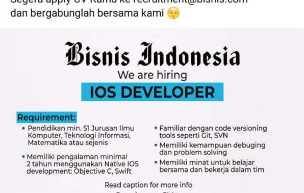 Bisnis Indonesia Group membuka kesempatan untuk bergabung dan berkarya di posisi: iOS Developer