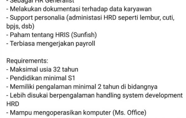 - Paham tentang HRIS (Sunfish) - Terbiasa mengerjakan payroll Requirements: