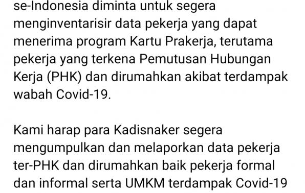 Bagi Pekerja Formal ter-PHK dan Pekerja yang di Rumahkan(unpaid leave) agar mendaftarkan diri segera ke Dinas Tenaga Kerja Kabupaten/Kota (sesuai domisili perusahaan)