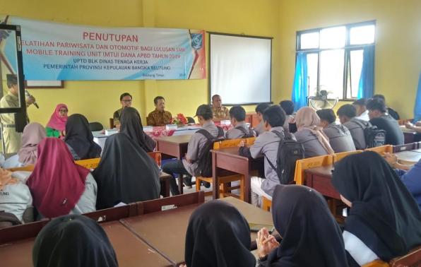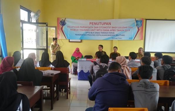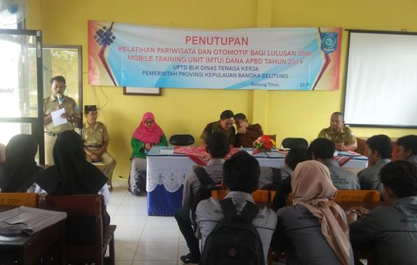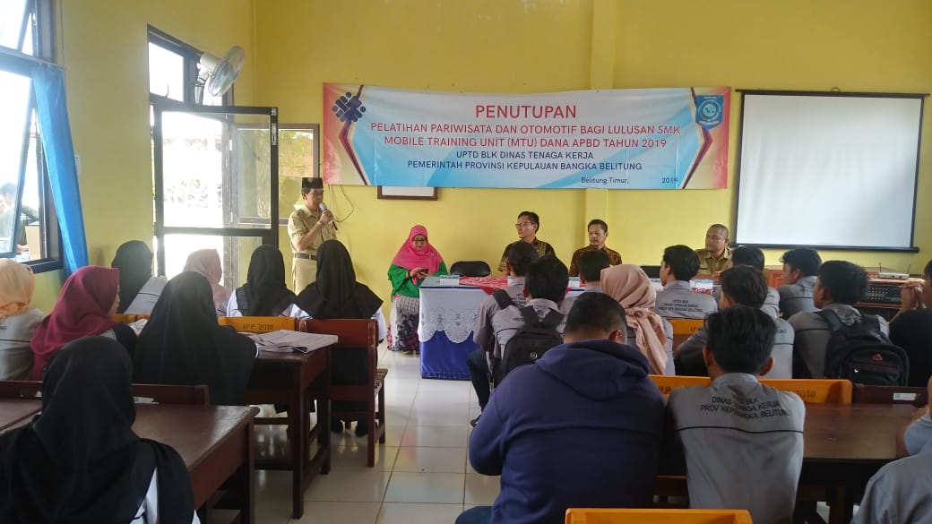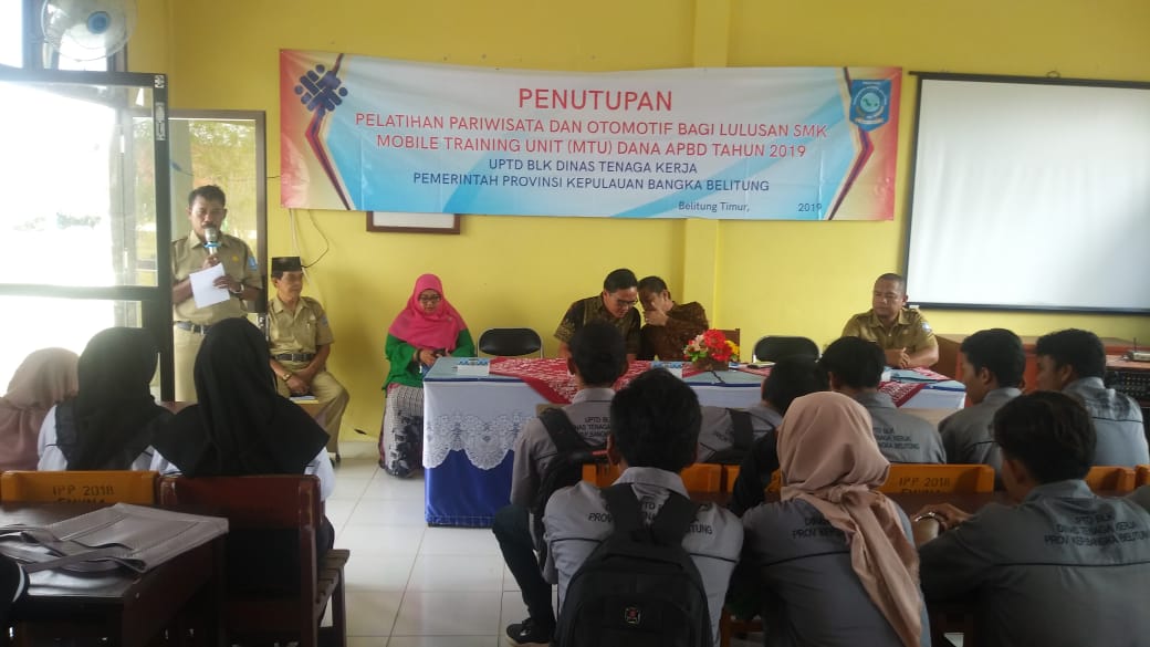 Beltim, Kepala Dinas Tenaga kerja Pemprov Kep Babel,Ceppy Nugraha menutup secara resmi pelaksanaan Pelatihan kejuruan berlokasi di Kabupaten Belitung Timur,senin (12/08/19) didampingi oleh jajaran pejabat Dinas tenaga kerja Belitung Timur untuk menutup pelaksanan pelatihan yang di anggarkan dari dana APBD Pemprov Babel.