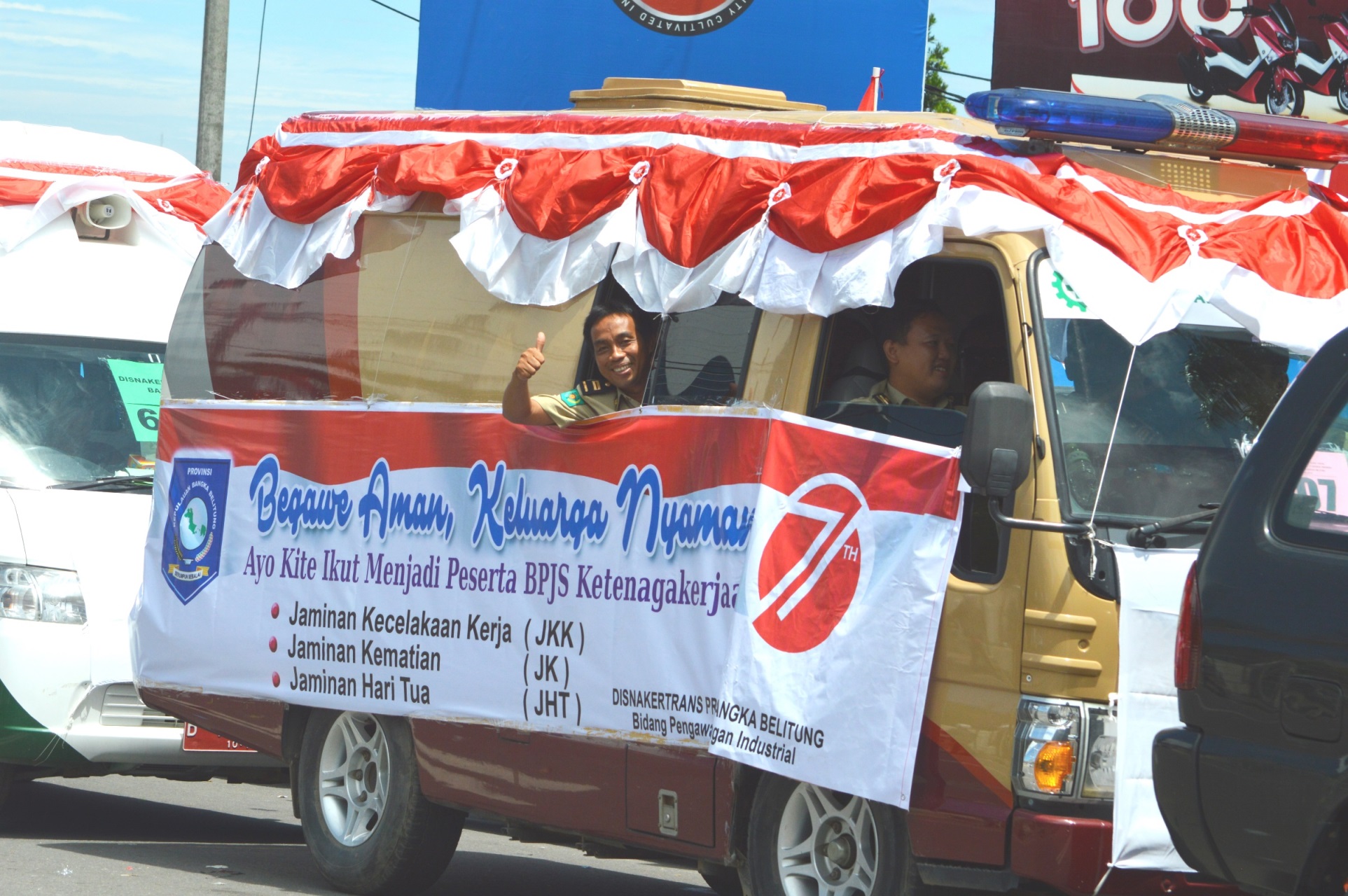 Pangkalpinang, Dengan mengangkat tema “Jaminan ketenagakerjaan” Dinas Tenaga Kerja dan Transmigrasi Pemeritah Provinsi Kepulauan Bangka Belitung (Disnakertrans Pemprov Kep Babel) mempublikasikan melalui sepanduk berkenaan dengan BPJS Ketenagakerjaan, dalam acara karnaval mobil hias di Pangkalpinang, Minggu 21 Agustus 2016.