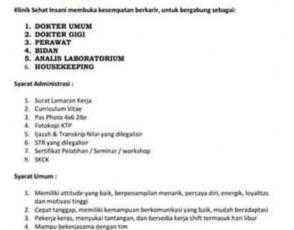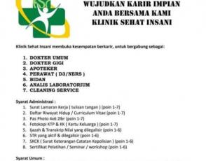 dokter Umum,dokter gigi,perawat,bidan,analis Lab & houseekeeping @klinik sehat insani-Bangka Tengah.