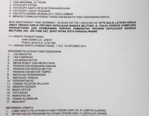 UPTD Balai Latihan Kerja Bangka Belitung bekerjasama dengan BPJS Ketenagakerjaan Babel akan menyelenggarakan Pelatihan GRATIS bagi warga masyarakat yang PERNAHÂ menjadi peserta BPJS...