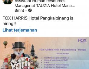 Front Desk Agent, General Maintenance Staff, Cook, DW(Housekeeping;Engineering; & Waitress) @Fox Harris Hotel Pangkalpinang