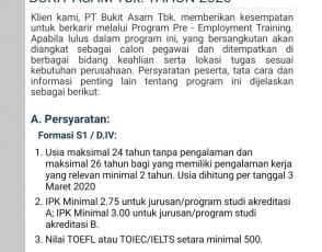 Klien kami, PT Bukit Asam Tbk. memberikan kesempatan untuk berkarir melalui Program Pre - Employment Training. Apabila lulus dalam program ini, yang bersangkutan...