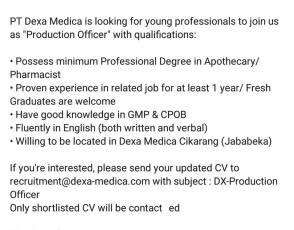 PT Dexa Medica is looking for young professionals to join us as "Production Officer"