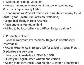 1. Associate Product Manager • Posess minimum Professional Degree in Apothecary/Pharmacist (preferably Male) • Experienced as Product Executive in similar company for at least 1 year (...