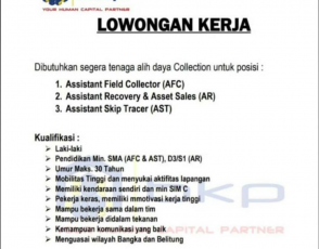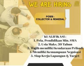 Pria(minimal pendidikan SMA), usia Maksimal 30 tahun, wajib memikiki kendaraan pribadi, memikiki kemampuan Negosiasi, siap bekerja dilapangan.